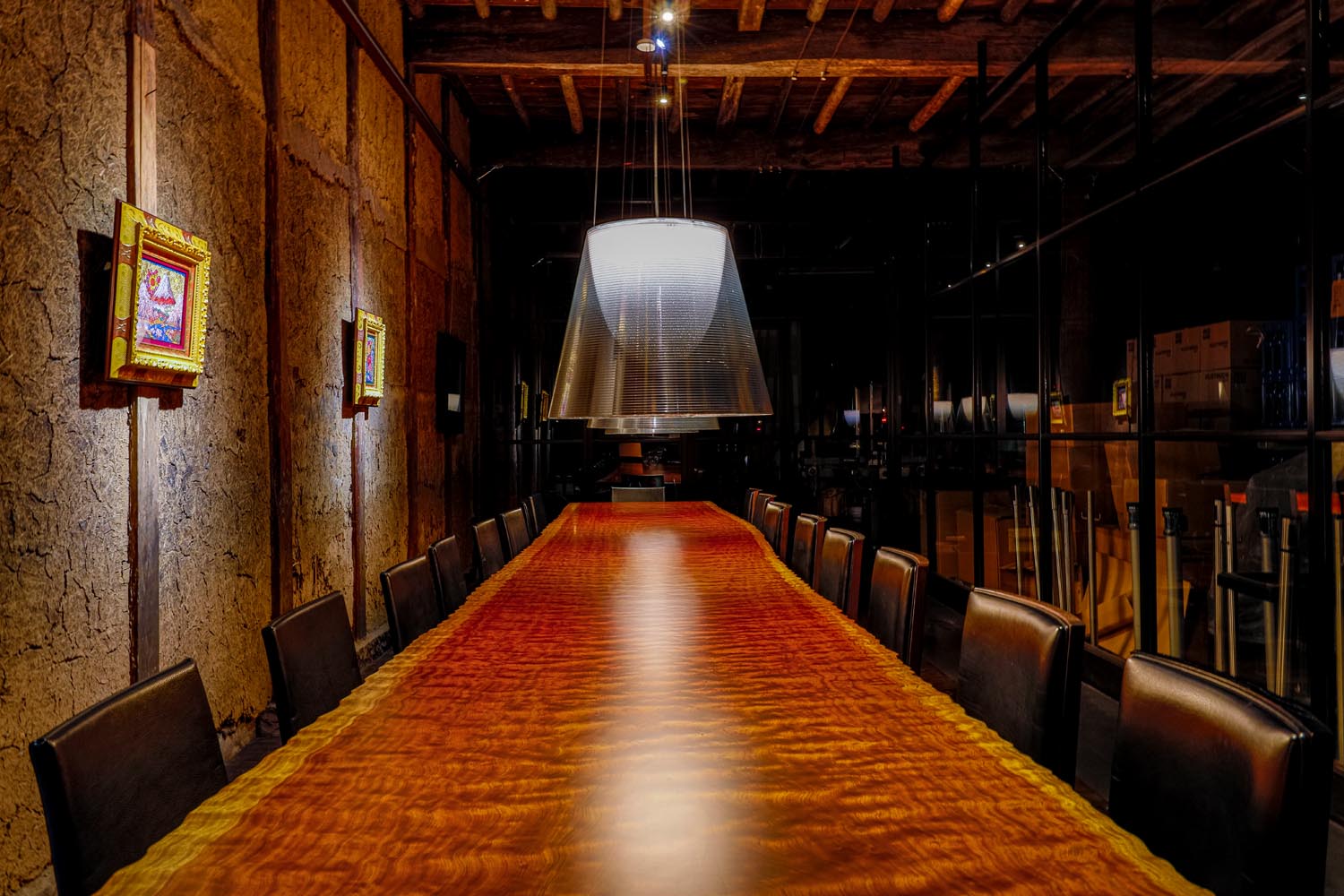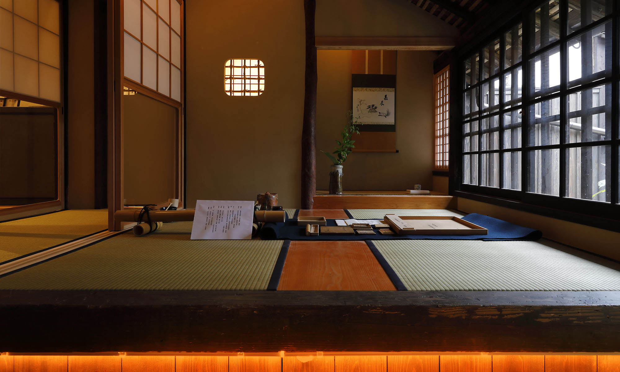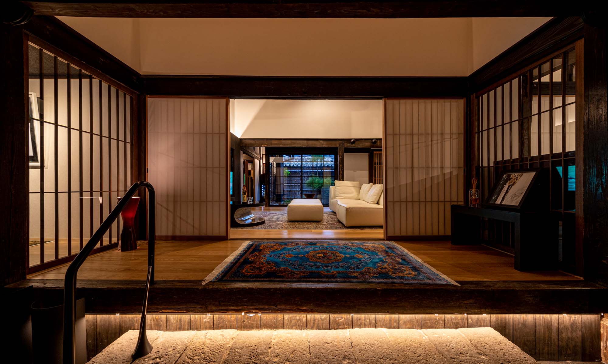 その酒蔵通りに面する御宿 富久千代は、今から230余年前(1780年代)に建てられた、この地域最大級の伝統的建造物、醤油や味噌などを製造していた旧商家が母体となっています。保存地区とはいえ建物の老朽化は進みます。そこでこの旧商家を修復・改築して「宿泊もできるレストラン(オーベルジュ)」として再生させたのです。「くど」(かまど)に似ていることに由来する「くど造り」の象徴的な茅葺き屋根は、専門の職人に依頼しその姿を再現。かつての醤油や味噌製造の名残である煉瓦造りの煙突も往時のままに保存しています。